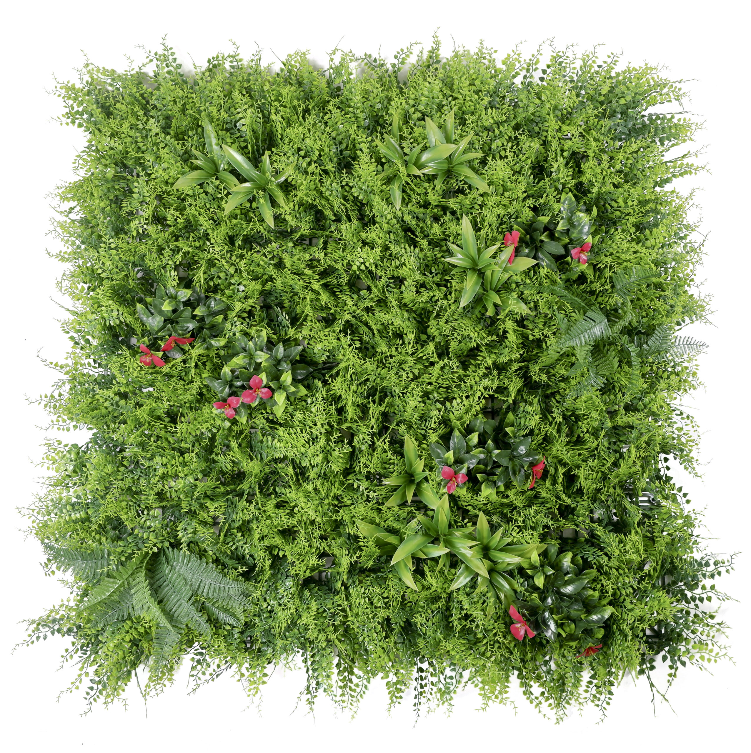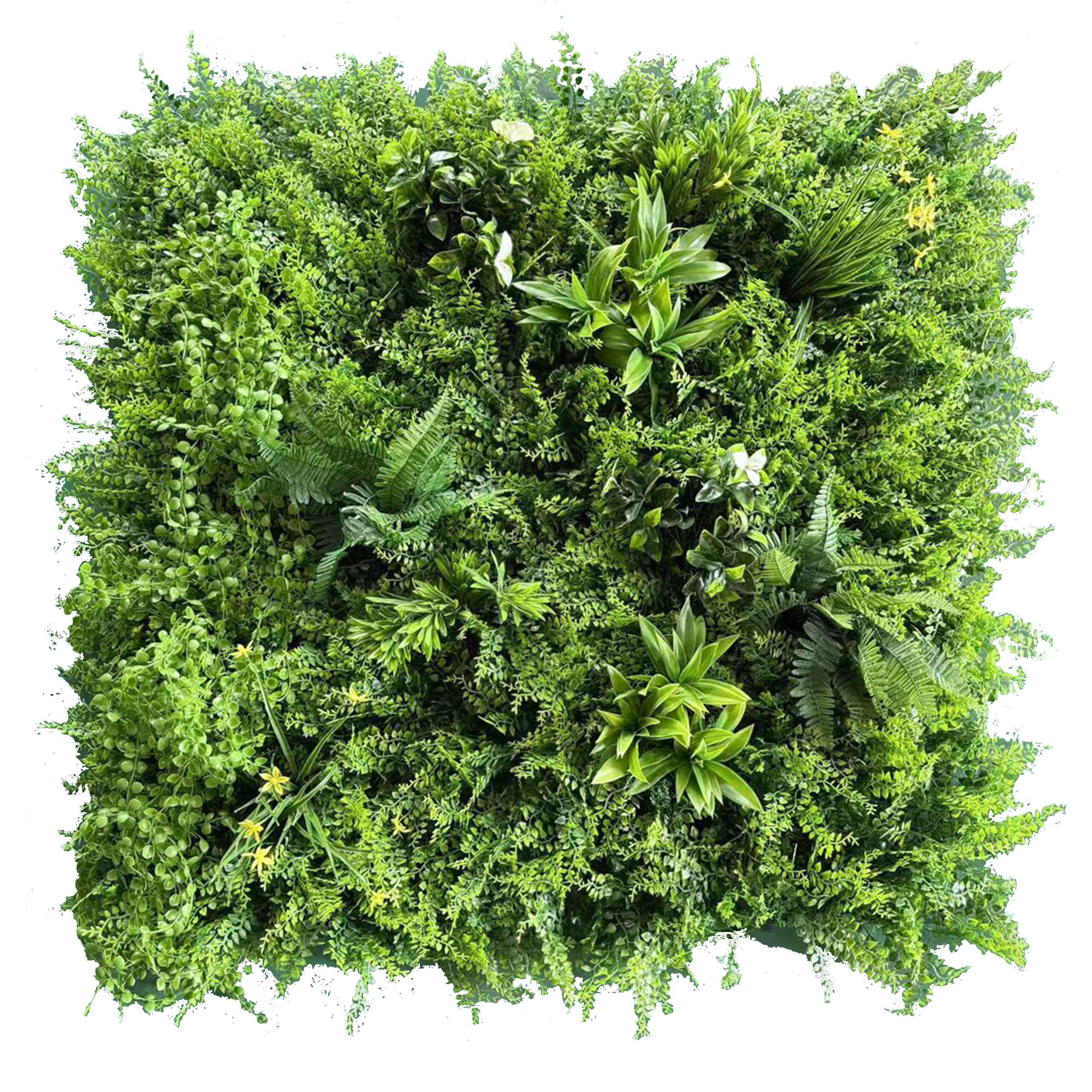 Designed to mimic the realistic appearance of natural plants, including ferns, creating a lush green wall effect.